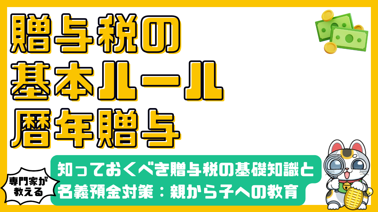 この記事では、お子さんへの教育資金の準備を考えている方、または既にお子さんの口座にお金を預けている方を対象に、贈与税の基礎知識、特に「暦年贈与」について詳しく解説します。年間110万円の基礎控除を有効に活用する方法や、思わぬ落とし穴である「名義預金」のリスクを回避するための対策についてもご紹介します。この記事を読めば、贈与税の基本を理解し、賢くお金を贈与する方法を身につけることができるでしょう。