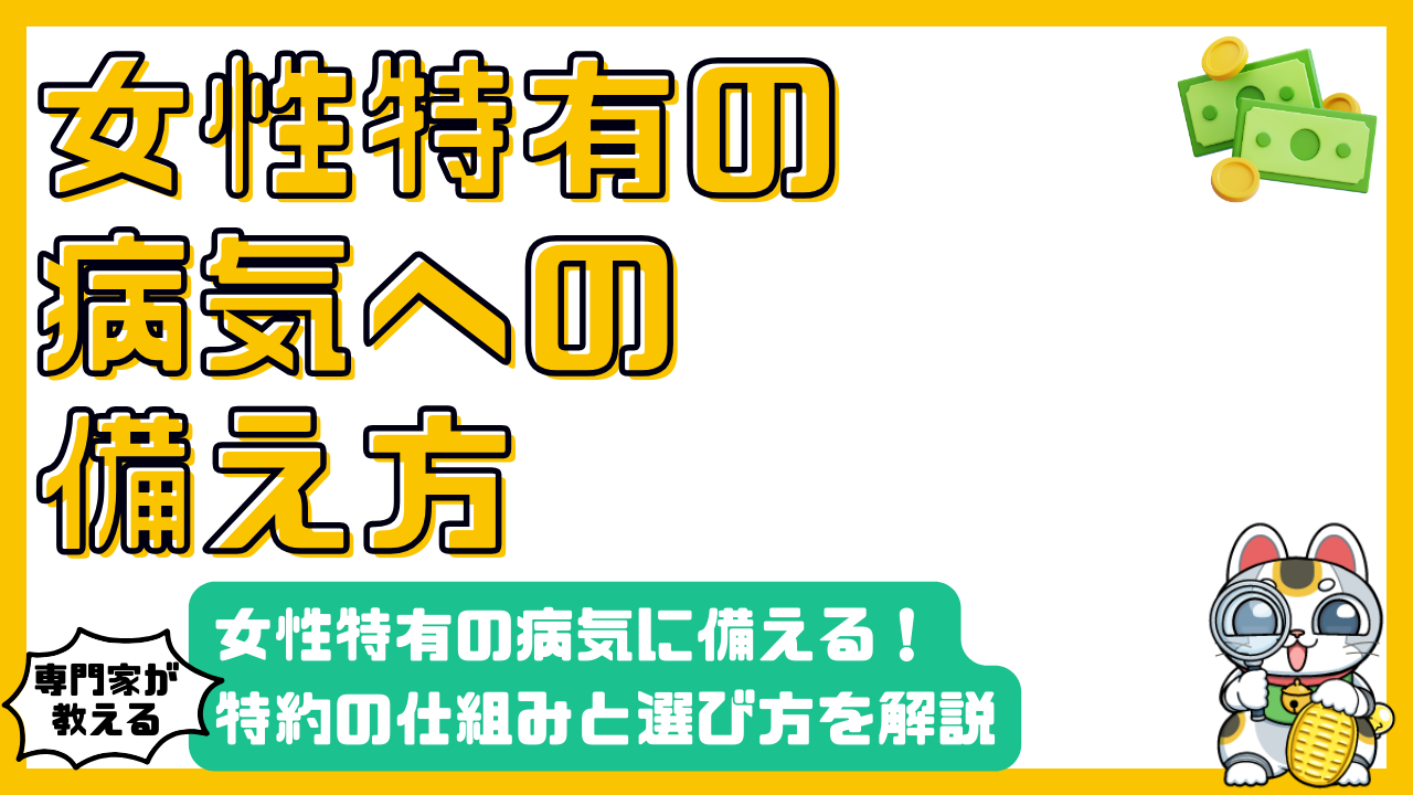 女性疾病特約とは、通常の医療保険に加えて、女性特有の病気で入院・手術した場合に、上乗せして給付金を受け取れる仕組みのことです。つまり、通常の医療保険の保障を、女性特有の病気に特化して強化する役割があります。