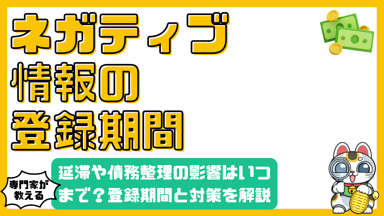 延滞解消後のネガティブ情報の登録期間は、信用情報機関によって異なりますが、一般的には、延滞解消日から約5年間とされています。この期間内は、新たなローンやクレジットカードの審査に通りにくくなる可能性があります。