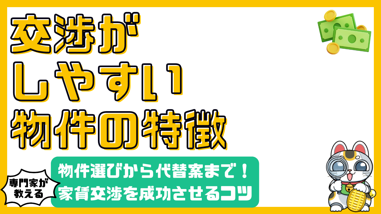 空室期間が長い物件や、個人の大家さんが管理する物件は、家賃交渉に応じやすい傾向があります。一方、新築物件や人気エリアにある物件は、交渉が難しいことが多いです。また、過去に退去理由がある物件は、交渉の余地がある可能性があります。